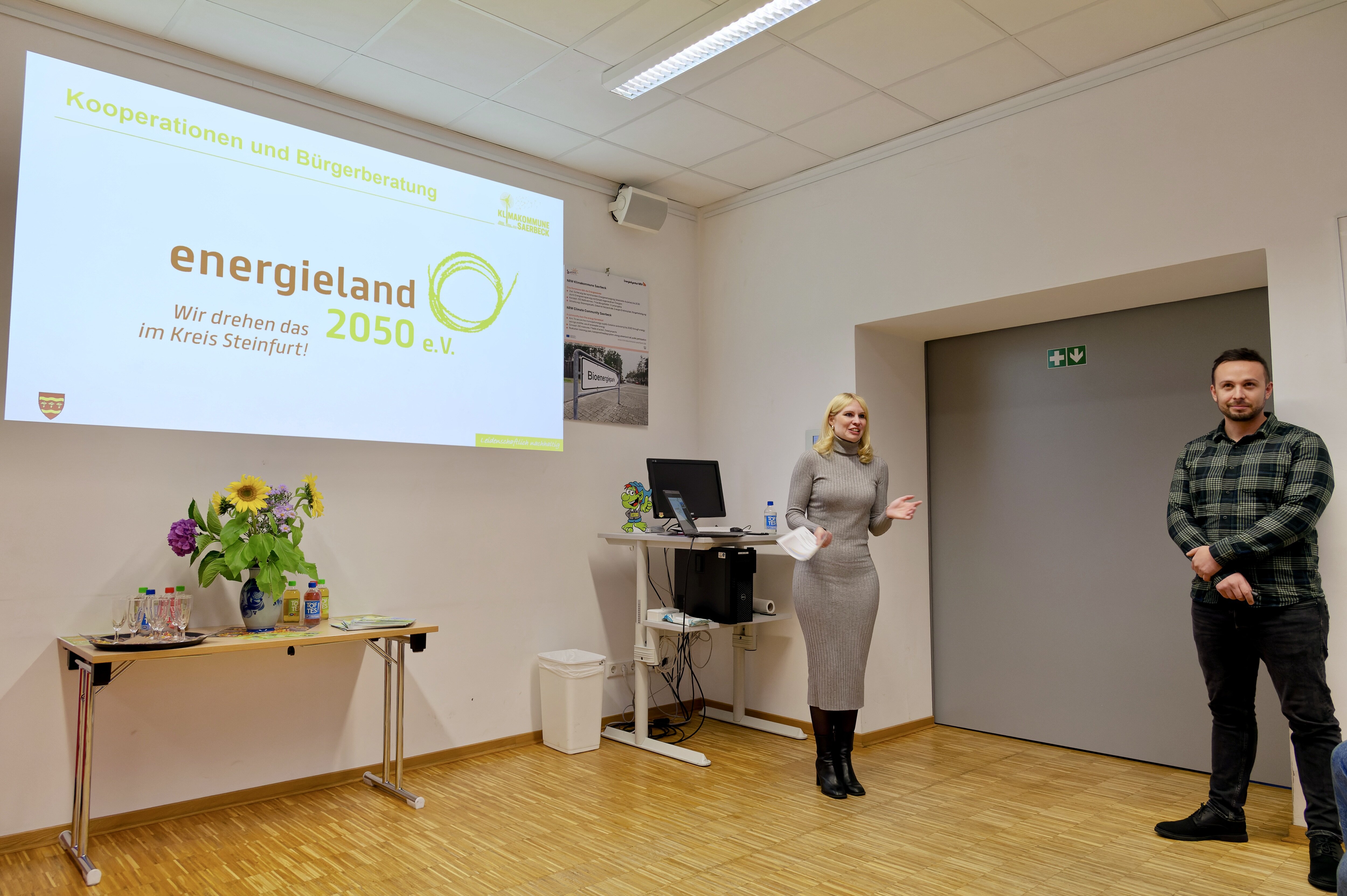 Freuten sich bei der Feierstunde anlässlich der 1000. in Betrieb genommenen Photovoltaikanlagen Saerbeck über das Engagement für Erneuerbare im Ort: Claudia Franca Machado vom Amt für Klimaschutz und Nachhaltigkeit des Kreises Steinfurt und Martin Sammler, Leiter der Stabsstelle Klimaschutz im Saerbecker Rathaus. „Es hat ein halbes Jahr vom Angebot bis zum Netzanschluss gedauert“, berichtete Niklas Dirksen bei der Feierstunde in der Gläsernen Heizzentrale. Mittlerweile könne er den Eigenverbrauch des PV-Stroms auf 70 bis 80 Prozent beziffern. Das ist Strom, der günstig vom eigenen Dach kommt und nicht vom Versorger gekauft werden muss. Adrian Mühlenkamp rechnet damit, dass sich die Investition von 18.900 Euro in neun Jahren bezahlt gemacht hat. Und die Energiewende bei Dirksen und Mühlenkamp ist noch nicht zu Ende. Aktuell ist eine Solarthermieanlage in Arbeit, die mit Sonnenlicht Wasser erhitzt, um die Heizung zu unterstützen. Die Energiekosten für das Haus sollen dauerhaft runter. E-Auto und Wallbox sind ebenfalls auf der To-do-Liste.