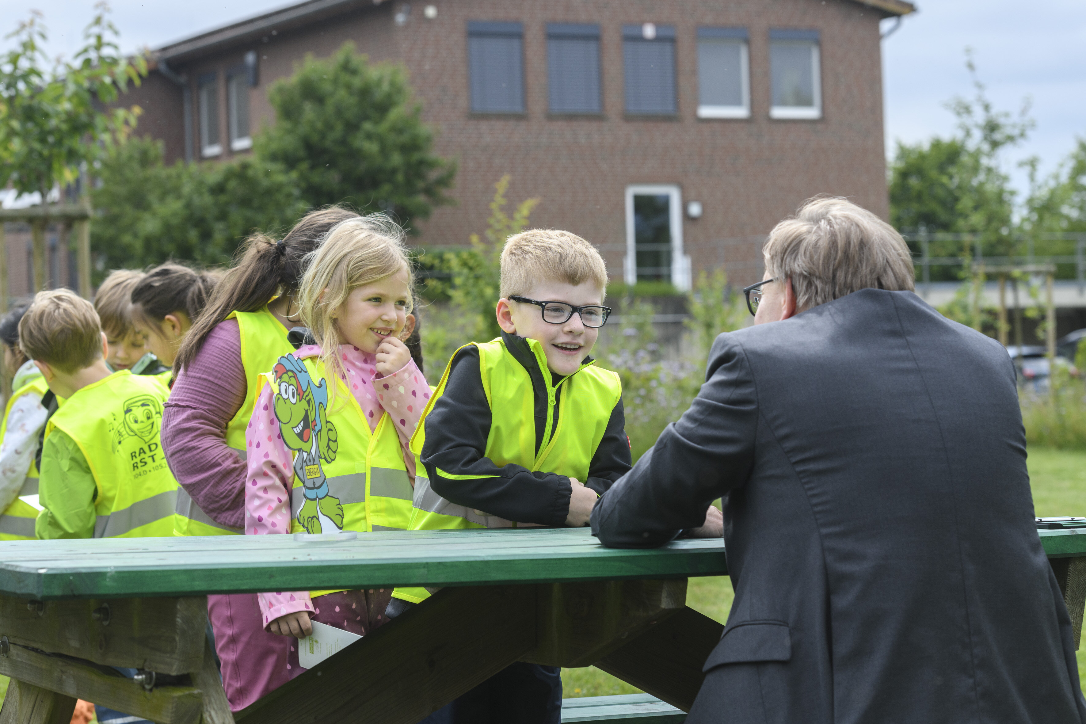 Über den vierten Stempel in seinem Forscherpass für Klimaschützer freut sich hier Anton aus dem Saerbecker Kindergarten St. Marien. Ein bisschen stolz ist er auch, denn immerhin drückt der Saerbecker Bürgermeister Dr. Tobias Lehberg den Stempel in seinen Pass. Neben Anton warten Nela und die anderen Vorschulkinder, die am vergangenen Montag zum Abschluss der diesjährigen Forscherpass-Aktion der Saerbecker Kindergärten den Bioenergiepark erkundet und viele spannende Dinge erlebt haben. In ihren Kindergärten haben sie Luft und Wind erforscht, die Energie der Sonne erkundet und sich mit Müllvermeidung und Stoffkreisläufen beschäftigt. Für jede Forscheraufgabe gibt es einen Stempel, die Erkundung des Bioenergieparks mit dem Team der Saerbecker Energiewelten wird mit dem vierten und letzten Stempel belohnt. Am Montag, 3. Juni, waren die Kindergärten Kaleidoskop, Regenbogen und St. Marien zu Gast, am kommenden Montag erkunden Kinder aus den Einrichtungen Emilia, Funkelstein und Sonnenschein den Bioenergiepark. Bei der Forscherpass-Aktion machen die Kinder mit, die nach den Sommerferien die Grundschule wechseln.
